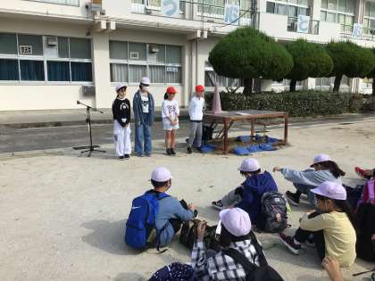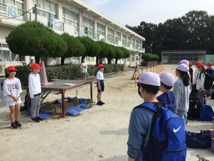 運動場で出発式をしました。わくわくした気持ちを切り替え、真剣な表情で出発式を行いました。