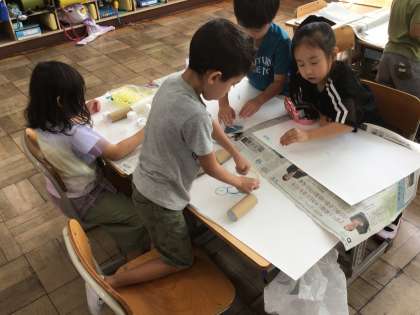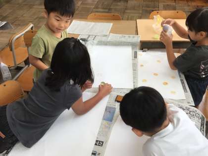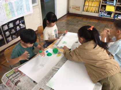 9/19 1年生図工1 公開日 2025/09/19 更新日 2025/09/19 各学年から 1年生図工では、いろいろなものをつかって、スタンプを押して作品を作りました。ペットボトルのフタや、丸い芯、箱などに色をつけて画用紙に押しました。とても楽しく活動する姿が見られました。