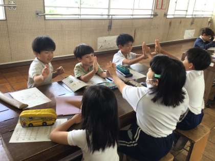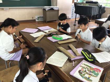 9/19 3年音楽 公開日 2025/09/19 更新日 2025/09/19 各学年から 3年音楽では、「ハッピーソング」「ゆかいなもっきん」を歌ったり、リズム練習として「茶つみ」の手遊びをしたりしました。「拍にのってリズムを感じとろう!」というめあてで学習を進め、リコーダー練習をがんばりました。