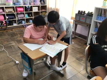 3桁÷2桁のわり算の筆算の学習です。数が大きくなるほど、答えの数字の見当をつけるのが難しくなります。問題を解いていくにつれて、答えになる数字の見当をつけるのが速くなっていきます。問題を早く解き終わった子は、友達に分かりやすく教えていました。
