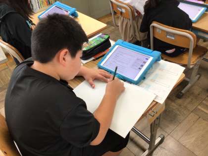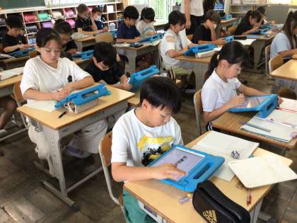 犬山城がどのように守られてきたのかを学習用タブレットを使って調べました。約500年前に築かれた犬山城は国宝です。大震災などを乗り越えて、今もなお立派に残る犬山城の歴史の長さを知りました。