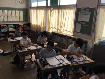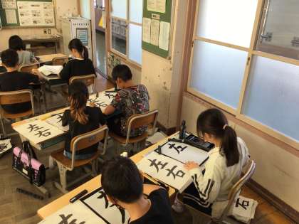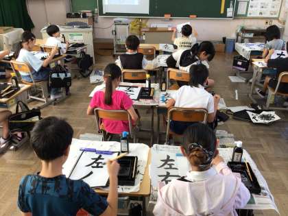 4年書写では、「筆順や字形を意識して書こう」というめあてで学習を進めていました。「左右」という2文字を半紙にバランスよく書くだけでなく、それぞれの字の形が難しいと思います。集中して練習をしていました。