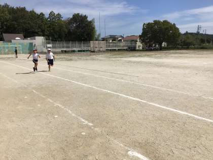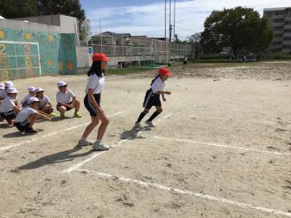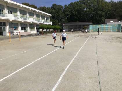 50メートル走の計測をしました。腕を一生懸命にふって、ゴールの先まで走り抜けました。タイムは上がったでしょうか。
