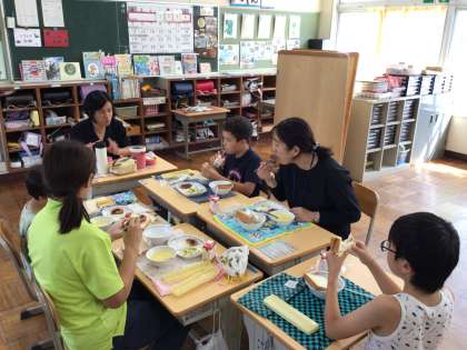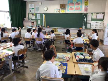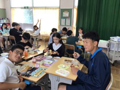 今日の献立はエビカツでした。パンに挟んで笑顔で食べていました。友達と一緒に食べる給食は楽しいね。