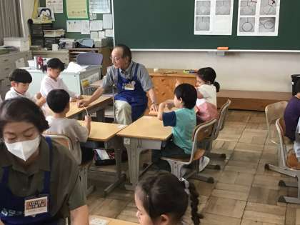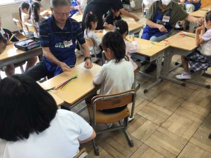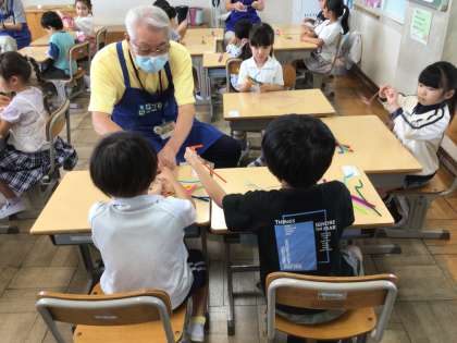1年生生活科では、「ものづくり教育プログラム」の講師の方々をお招きして、シャボン玉の「フラッパー」を作りました。ハンガーを丸い形にして、カラフルなモールを巻いていきます。