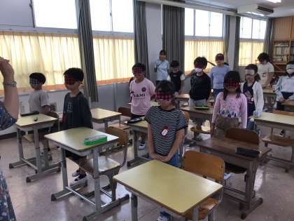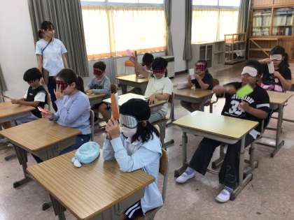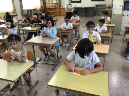 10/7 3年生アイマスク体験2 公開日 2025/10/07 更新日 2025/10/07 各学年から アイマスクをつけて、折り紙を折ったり、片足立ちをしたり、音の聞こえ方を体験したりしました。「難しい」「見えないとバランスがとりにくい」などと体験したからこそ分かったことがありました。