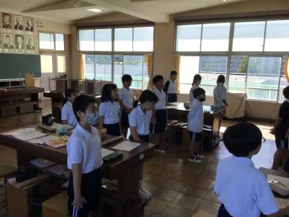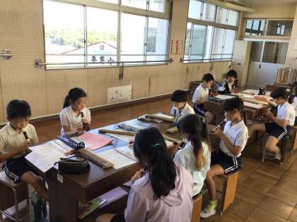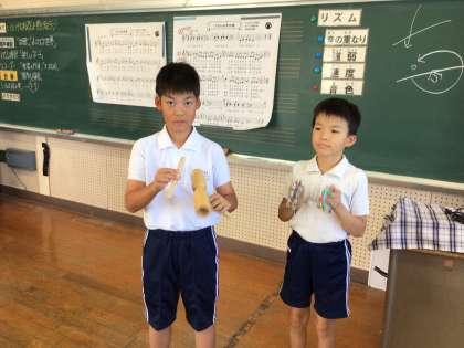10/9 4年音楽 公開日 2025/10/09 更新日 2025/10/09 各学年から 4年音楽では、明日の終業式で歌う校歌を練習しました。「いろいろなリズムを感じ取ろう」というめあてで学習を進め、リズム練習「楽しいマーチ」や「いろんな木の実」をリズム伴奏をやりました。 また、音楽ワークで習った音楽用語などを復習しました。
