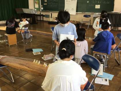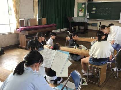 10/10 5年生音楽 公開日 2025/10/10 更新日 2025/10/10 各学年から 5年生音楽では、「和楽器体験」で琴を演奏する体験をしました。「さくら」の楽曲を講師の方に教えていただきながら、演奏することができました。