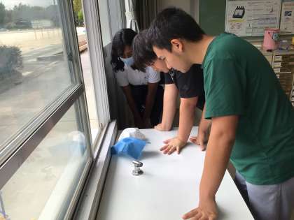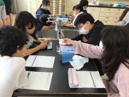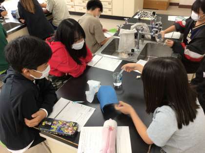 衣服の着方の学習として、綿とナイロンの布の違いを調べました。触り心地や水の吸いやすさ、水の乾きやすさなどを比べました。綿やナイロン、ポリエステルの性質を知り、夏や冬の衣服の着方を考えました。