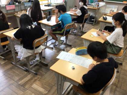 今日の5限の学活の様子です。通知表の配付と並行して前期の振り返りを記入している学級も見られました。週明け火曜日から後期になります。担任の先生からのアドバイスをもとにがんばっていきましょう。