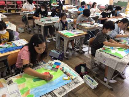 10/14 6年図工 公開日 2025/10/14 更新日 2025/10/14 各学年から 6年図工では、言葉から想像を広げての単元を進めています。今日は「くじゃくの花火」の読書感想画の仕上げです。先生のアドバイスをもらいながら作品づくりを進めていました。