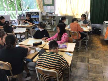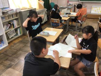 4年生算数では、コンパスや分度器を使って、角度や計算の復習をしました。グループで話し合いながら、問題に取り組みました。