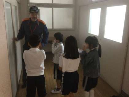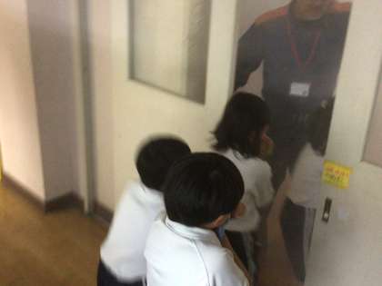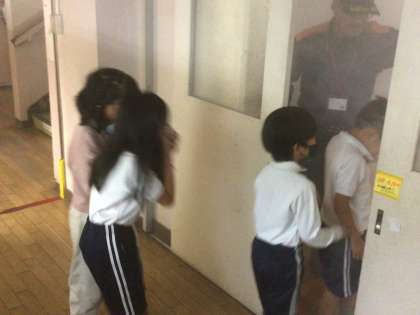ランチルームで、机を避けながら進みます。マスクやハンカチを口や鼻にあてて、体験しました。