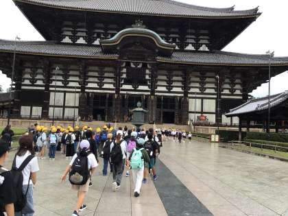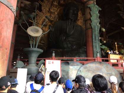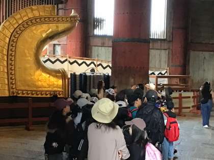 東大寺の大仏殿を見学しています。想像以上の大きさで驚いた様子でした。