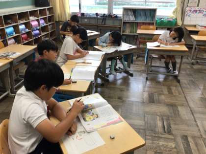 「たからさがし」というお話を読んで、正しいと思ったことを行動に移す勇気について考えました。友達が「やろう」と言ったことを迷いながらも断る主人公の気持ちを自分だったらという視点で考えたり話し合ったりしました。
