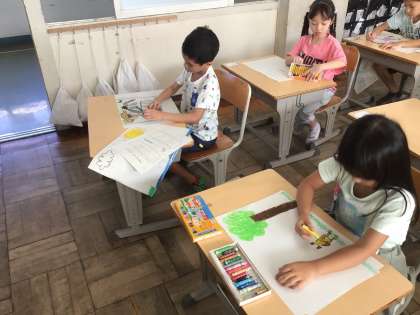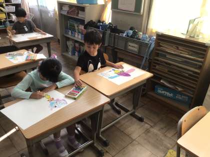 10/17 1年生図工 公開日 2025/10/17 更新日 2025/10/17 各学年から 1年生図工では、読書感想画で「ミリーと素敵な私の帽子」という本を読んで、心に残った場面の絵を描きました。ミリーをどこに描くかを決めて、クレヨンを使って描きました。