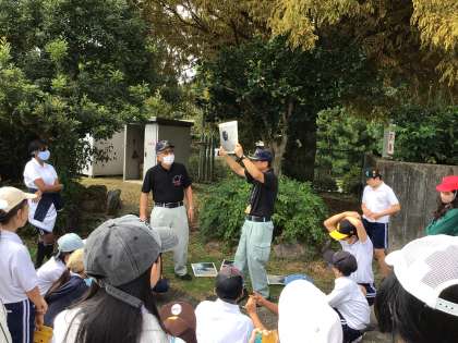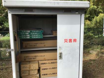 体育館での体験を終えた後、運動場の青い門の横にある災害用便槽の説明を聞きました。マンホールを利用して洋式の便座を設置するというものです。学校の災害用倉庫に収納されていることを初めて知り、驚いた様子でした。