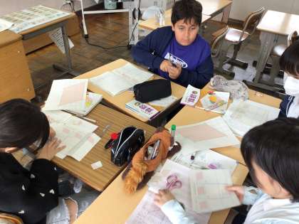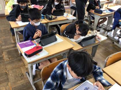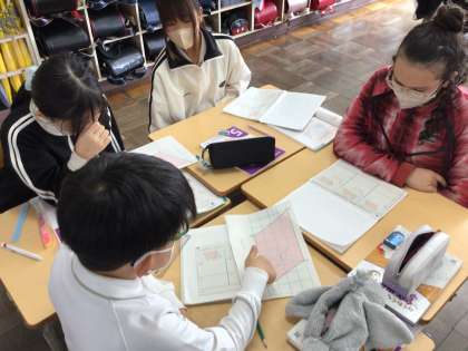 10/21 5年算数1 公開日 2025/10/21 更新日 2025/10/21 各学年から 5年算数は少人数で学習をしていました。3グループとも面積の単元を学んでいます。平行四辺形の面積の求め方について考えていました。