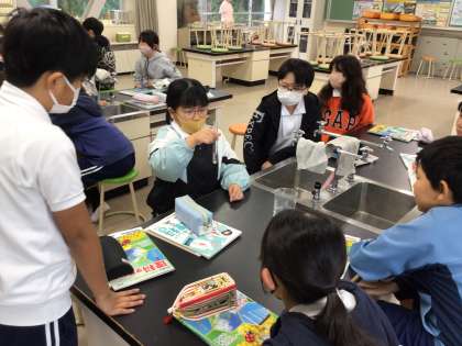 6年理科は理科室で実験を行っていました。水溶液の性質の単元を学んでいて、「炭酸水に溶けているものを調べよう」というめあてで学習を進めていました。試験管に炭酸水を入れ、軽く振ったり、湯で温めたりしたときの様子を観察しました。