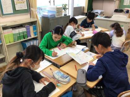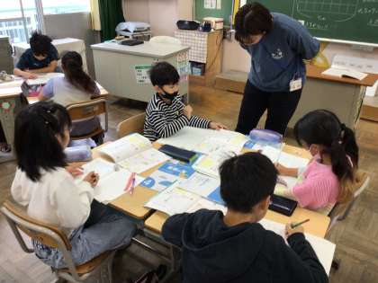 4年算数の少人数指導の様子です。面積の求め方を考えていました。