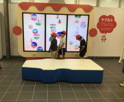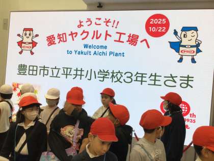 10/22 3年生ヤクルト工場見学 工場到着 公開日 2025/10/22 更新日 2025/10/22 各学年から 3年生はバスに乗ってヤクルト工場に到着しました。工場へ入ると早速ヤクルトの歴史に関する表示やヤクルト型のいすがあり、子どもたちは興味津々です。
