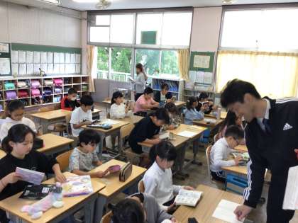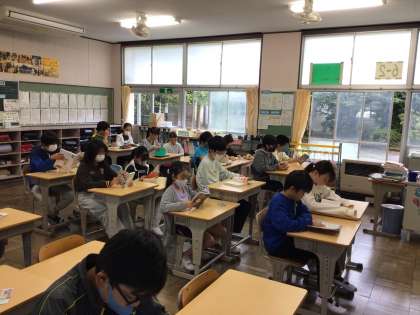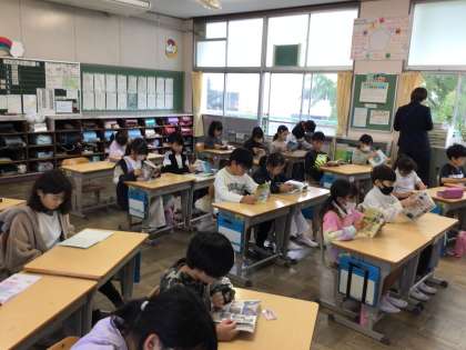 チャイムまでに朝の支度を済ませ、静かに読書が始まりました。よい姿勢で本を読むことができていますね。