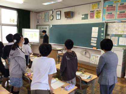 10/23 5年外国語 公開日 2025/10/23 更新日 2025/10/23 各学年から 5年外国語では、アクセントに慣れ親しもうのページを元気よく発音した後、Unit5 に入りました。動画に合わせて、一緒に歌いながら楽しく学習をしていました。