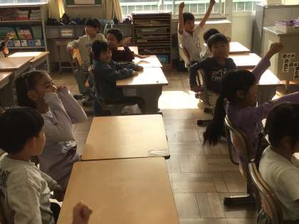 1年生の生活科では、「虫と仲よくなろう」の学習をしています。今日は、どんな虫が、どんな所にいるのかを考えました。虫のクイズをしながら、どのように虫を探すかグループで考えました。