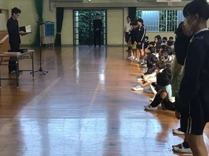 10/27 後期認証式1 公開日 2025/10/27 更新日 2025/10/27 各学年から 1時間目に、後期認証式が行われました。はじめに各クラスの後期学級委員が認証されました。名前を呼ばれたら大きな声で返事をして立ち、6年生が代表で認証状をもらいました。