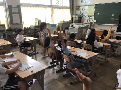 10/27 1年生国語 公開日 2025/10/27 更新日 2025/10/27 各学年から 1年生国語では、「は、へ、を」の学習をしています。漢字ドリルの問題を解き、⬜︎にはいる文字を選んで発表しました。