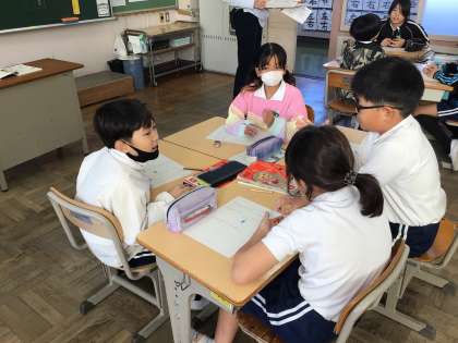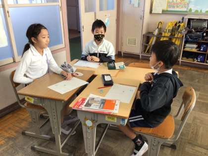 説明文「くらしの中の和と洋」の学習を生かして、身近な和と洋を比べる新聞作りに取り組みます。今日は「衣食住」のどれについて調べるか、新聞名はどうするかを班で話し合いました。班のみんなにの意見を聞くために「◯◯さんは、どう?」などと尋ね合う様子が見られました。