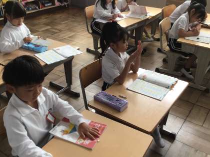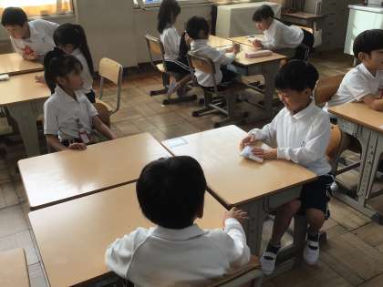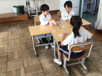 1年生算数では、算数の友の問題練習をしてから、計算カードでたし算カードで練習をしました。えがおトークのグループで問題を出し合いました。