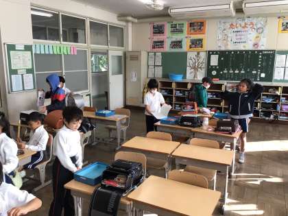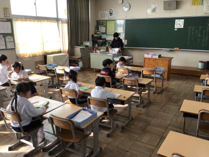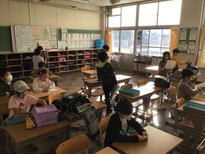 今朝は昨日以上に冷え込み6度を記録、寒い朝となりました。子どもたちは通学団でいつも通り元気よく登校してきました。教室では、2限のどんぐりごま大会の話をしながら、朝の支度をしていました。