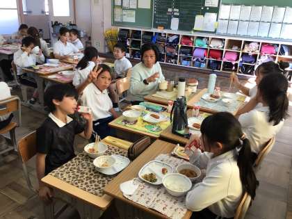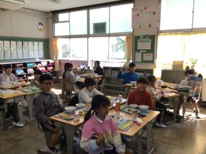 今日の献立は大根のそぼろ煮、イカフライでした。どの学級も友達との会話を楽しみながら会食をしていました。友達と食べる給食はおいしいね。