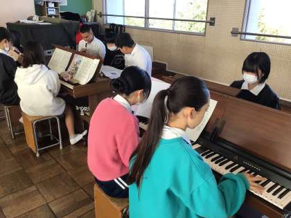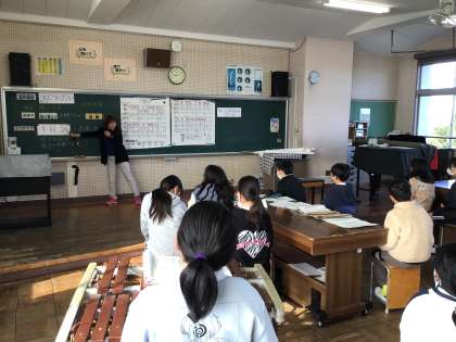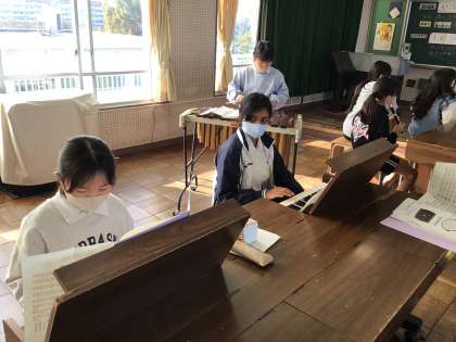 6年音楽では、「雨のうた」を練習しています。「音の重なりを聴きながら合奏しよう」というめあてで、イ短調とハ長調の違いについて考えながら練習をしていました。