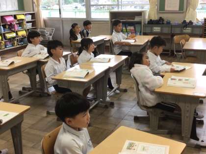 1年生国語の「はっけんしたよ」では、文の書き方を学習しています。どんな文章で、マスの使い方や句読点の位置も確認しながら学習しました。