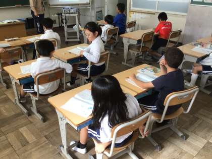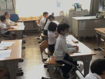 2年生国語では、「主語、述語」の学習をしています。今日は「何が、どうした」「誰が、何だ」などの文章を絵に合うように書きました。