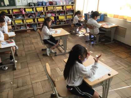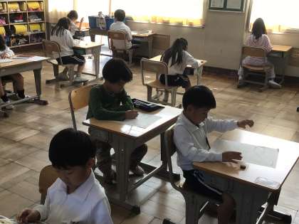 1年生算数では単元のまとめテストを行いました。今まで学習した「たし算」「ひき算」のテストです。みんな真剣に取り組んでいました。