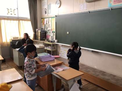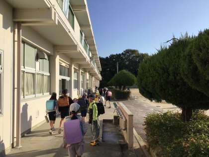 気持ちのいい天気のもと、子どもたちは元気よく登校してきました。教室では、時間を見ながら準備を進めていました。