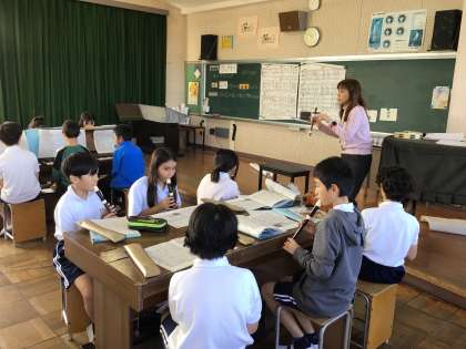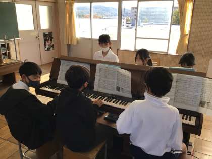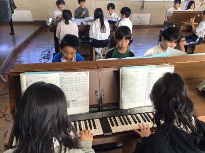 5年音楽ではs、「曲想を感じながら合奏しよう」というめあてで、「キリマンジャロ」を練習していました。スタッカートで演奏する部分について、先生がアドバイスしていました。