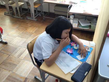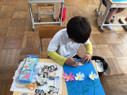 11/7 8組生単 公開日 2025/11/07 更新日 2025/11/07 各学年から 8組生単の時間に、10月の思い出の掲示物を作りました。写真を丁寧に切り取って、画用紙に1枚1枚配置を考えながら糊づけをしていきました。