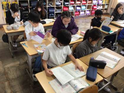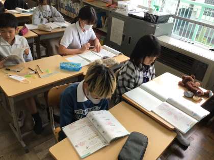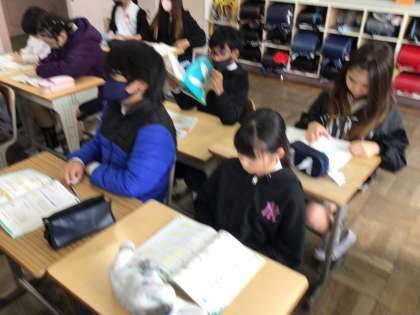 5年算数では、面積を学んでいました。今日は1・2組ともに単元テストです。面積の公式など最後の確認をしていました。