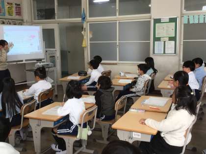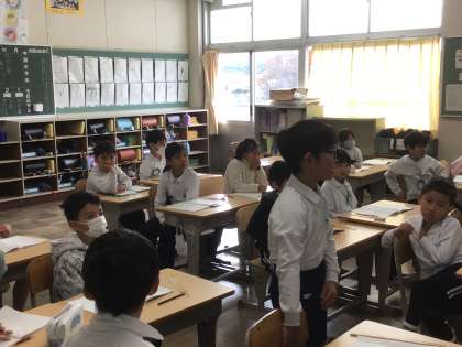 2年生算数では、「かけ算」の文章問題を解き、式を考えました。「一つ分の数が何かを考えて」式をペアで話し合い発表しました。「5×3」なのか「3×5」なのかの理由も考えました。