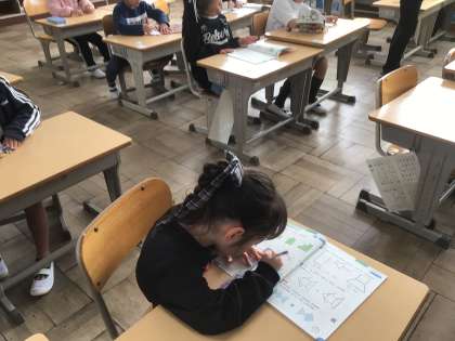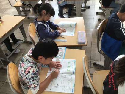 1年生算数「かたちづくり」の算数の友で問題練習をしました。