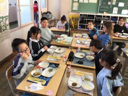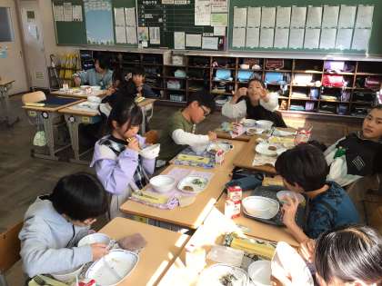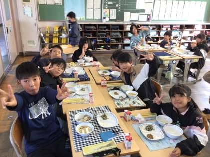 今日の給食の様子です。友達と一緒に食べる給食は美味しいね。