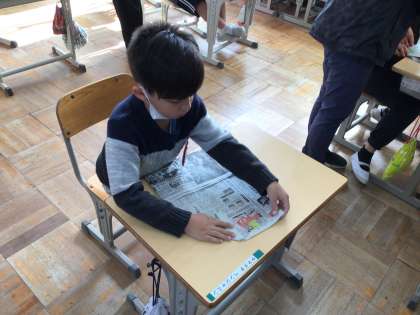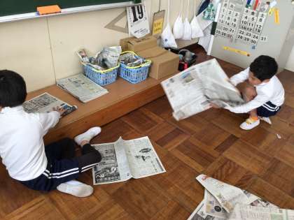 今日のサツマイモを入れる袋づくりの様子です。新聞紙を丁寧に折って袋を作りました。