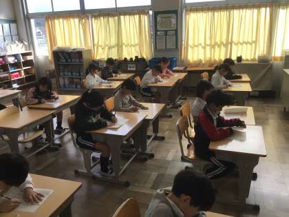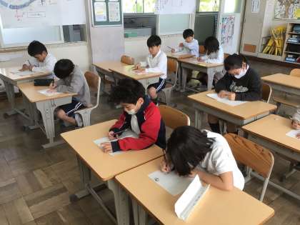 2年生書写では「書き初め」の練習をしました。書き初めの練習は2回目です。お手本をよく見て、名前を書いたり、本文を練習したりしました。