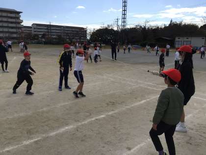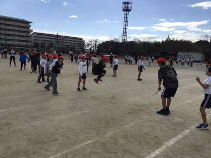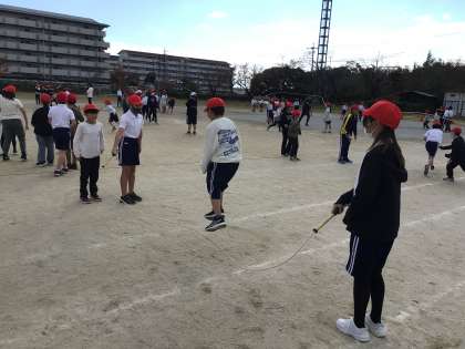 今日の給食後は運動場に集まって大縄練習を行いました。リーダーの指示を聞いて5分間練習を行いました。