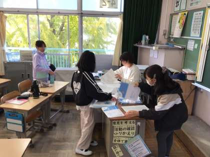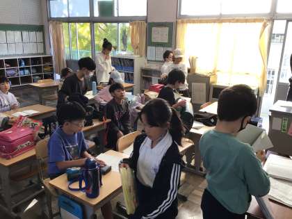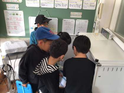 学習用タブレットを保管庫に戻したり、来週火曜日の連絡を記入したりするなど、朝の支度を進めていました。