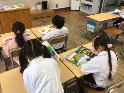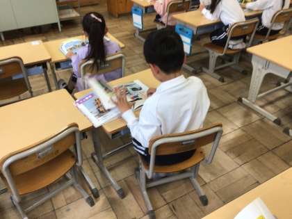 1年生国語では、「いろいろなふね」の学習をしています。今日は、調べたい乗り物を決めてじっくり読みました。